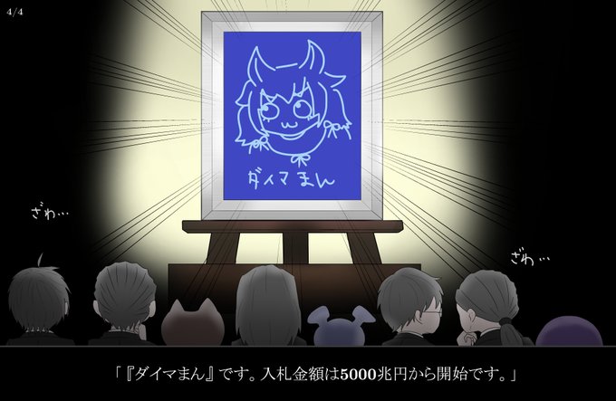 6月8日のパスパルトゥー実況で、配信中に名作がたくさん生まれた訳ですが、それらが巡り巡って最終的にオークションで出品されるんやろなと思って描いた。変な所あるかもしれないですがご愛嬌で。#しまはいあーと
