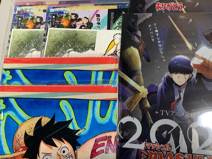 入場者特典の一部のステッカーなどやマッシュルのクリアファイル、ワンピースのレジャーシートなど送料くらいで入用な方いらっしゃいませんかね?