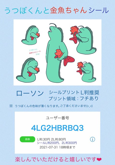 うつぼくんと金魚ちゃんシール🦈🌹 ネットワークプリント登録しました✨ ローソン🐄 ユーザー番号: 4LG2HBRBQ3 有効期限: 2021-07-31 18時頃まで 詳しくは画像をご覧ください。 ぜひご利用くださいませ(>_<)💕