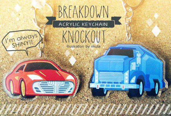 ブレークダウンとノックアウトのビークルモードを自分好みにデフォルメしてアクリルキーホルダーにしたやつが今日届きました!全部イラレで描いてみたよ!キラキラしてて出来に満足!!