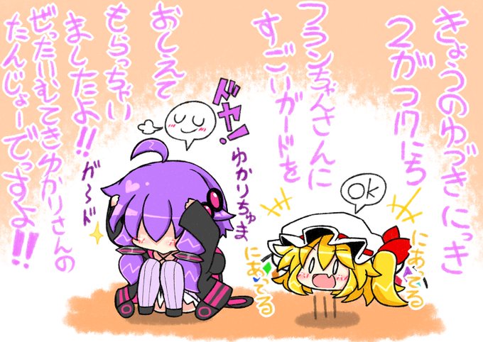 今日のゆづき日記。普段はゆっくりたちに色々なことを教わったり遊んでもらったりゲームしたりしているゆかりさん。今日はなにやらカリスマ的なガードをレクチャーされてる様子。似合うなぁゆかりさん!そんな絶対防御将軍なゆかりさんとフランちゃんを素材にしました!ご利用ください! #結月ゆかり