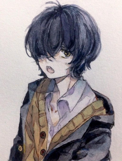 #フォロワーさんからイメージもらって自分を男子高校生化する 黒髪/サメ歯/目に髪の毛かかってる/色白/シャツ+セーター着崩し/ブレザー ありがとうございましたー、楽しかった( ‘ᾥ’ )