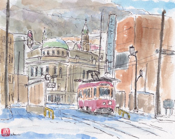 「雪の十字街(函館)」 秋に描いた十字街。雪でその時とは一変した風景にワクワクしながら描いた。(水彩F0) #スケッチ #函館 #水彩画