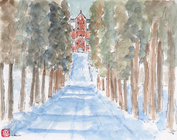 「修道院への道(トラピスト 修道院)」 (水彩F0) 渡島当別駅を出て15分ほど歩くとこの風景に出会います。まっすぐ続く雪の道。その先に見える修道院の姿がとても美しかった。 #スケッチ #水彩画