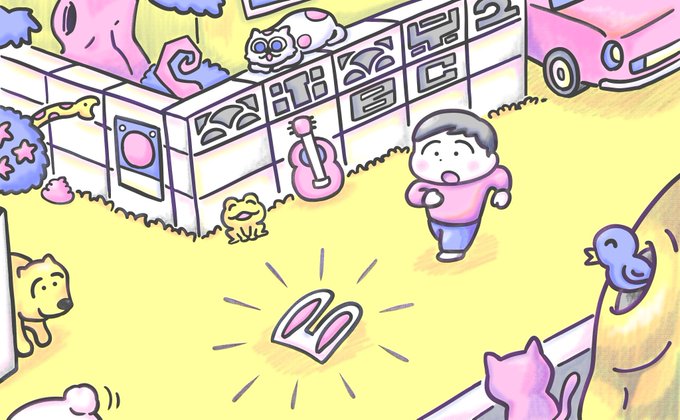 絵本を描いてみようと思い、5枚まで描きました。あとで文字を入れるつもりです。子供が動物の部位を拾って、 どんどん不思議な姿になりつつ、交番に拾った部位を返すという感じのお話だと思います。ラストは耳のないウサギや、鼻のないブタなんかが出る予定です。#絵本