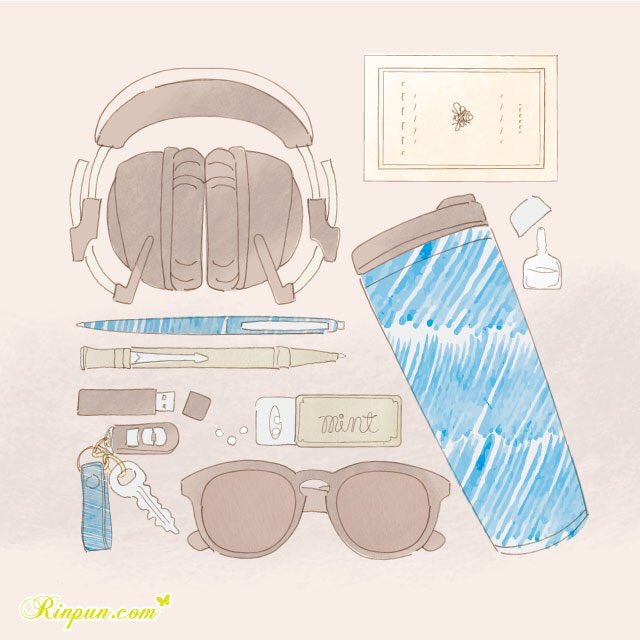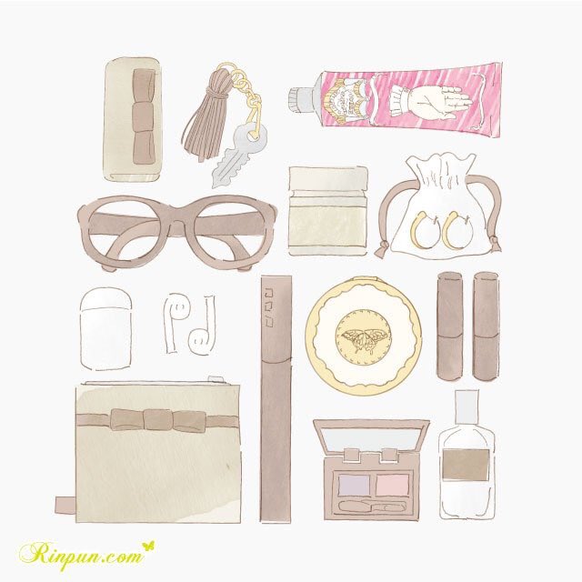 キーケース、ハンドクリーム、眼鏡、アクセサリー、iPod、保湿クリーム、マスカラ、コンパクト、リップ、アイシャドウ、香水。ヘッドホン、シャーペン、ボールペン、USBメモリ、ミントタブ、キーレスエントリー、サングラス、タンブラー、文庫本、目薬