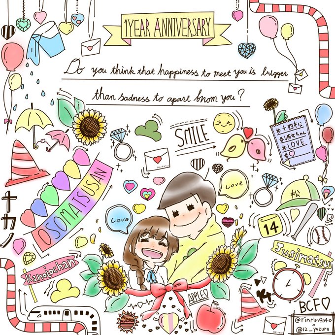 線画(真ん中の)[@rinrin9040 ] わちゃ×2加工[@12_yuzuru ] 加工の神様ななさんとコラボです!!!真ん中の彼女ちゃん&十四松はりんこりんご飴が、周りのイラストやらなんやらと色塗りはすべてななさんが担当してくれました!!!!ほんとに感謝!!