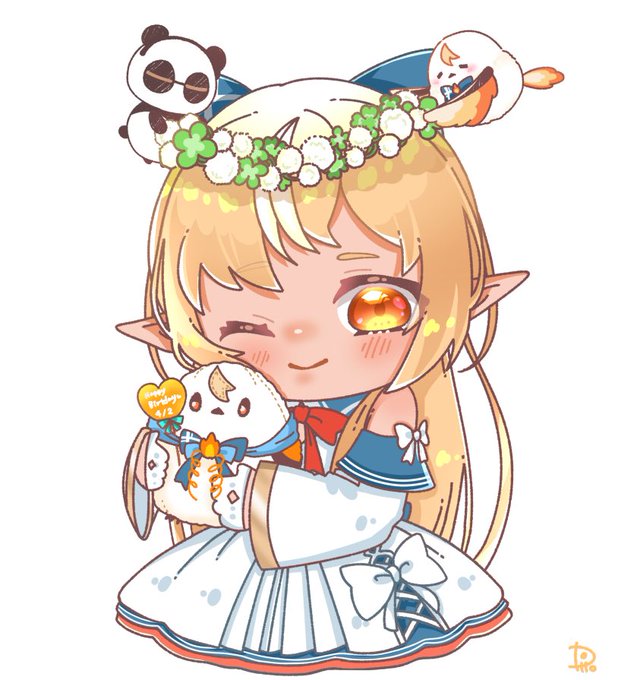 静止画。エルフレがぬいぐるみになったらいいなというそんな思いも込めてエルフレぬいぐるみを抱っこしてるフレアちゃん。 #しらぬえ