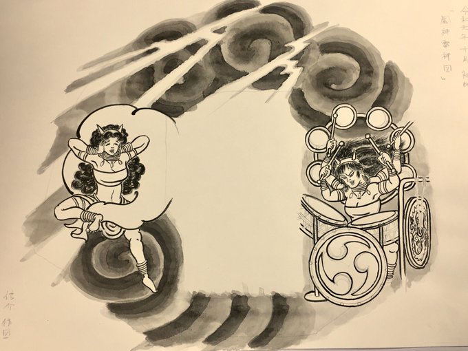 袖絵「風神雷神図」薄墨で背景塗り。 #ねぷた