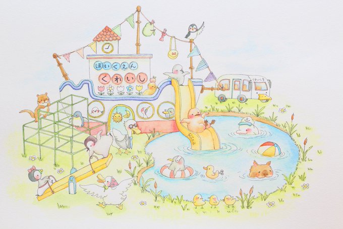 【個展展示原画ご紹介🐧】 「ありがとうの星屑」(油彩) 「あひる夫婦の保育園」(透明水彩) 「お母さんをひとりじめ」(アクリル) 【個展・ぺんぎんまみれ】 7/16~7/21、平日12〜18時、土日12~17時、入場無料、@大阪北浜ギャラリーAMRITA