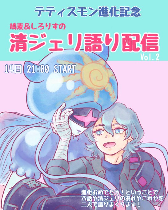 【告知】 テティスモン進化記念!ということで 14日21:00から再び鳩麦ちゃん(@hato_mugiGG )としろりすによる清ジェリ語りスペース配信します! 清ジェリ好きな方宜しければ聞きにいらして下さい♪ 配信中のコメントは #はとりすライブ でツイートして頂けると嬉しいです🕊🐿