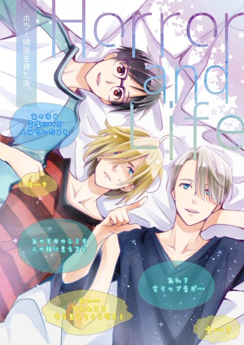 4日【西3i42b「ry」】でこんなヴィク勇本が出ます。3人でホラー映画を見るお話です。今表紙のヴィクトルの指輪の描き忘れに気づいて震えてます。どうぞよろしくお願いします。②に続く。 新刊「Horror and Life」サンプル① #氷奏ストラースチ2
