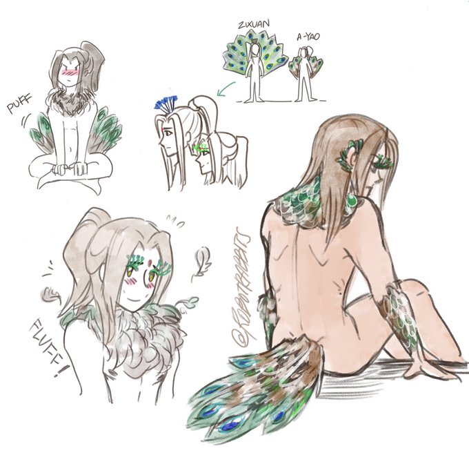 More peayao… his feathers are mottled and his train small because he’s half human (colors based on the intersex peafowls in the previous reply). Zixuan for comparison 🦚
