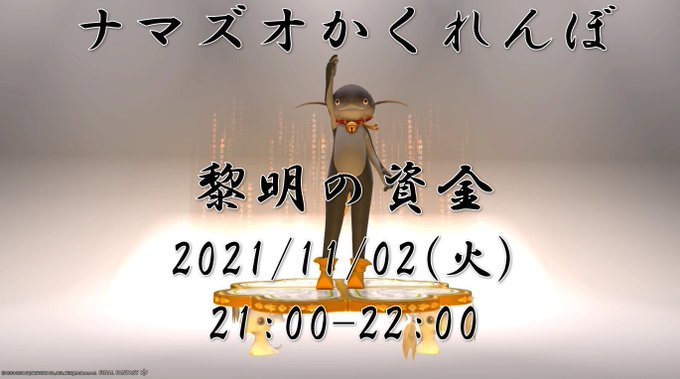 【GaiaDC Bahamut鯖】 ナマズオかくれんぼ明日っす 2021/11/02(火) 21:00~ ちなみに翌日の11/03(水)は祝日だぜい #色ログ #エオイベ