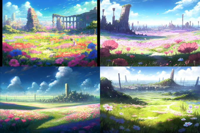 使用したプロンプト(AIを制作する時に指定するテキスト)は「滅んだ街と美しい花畑」です。