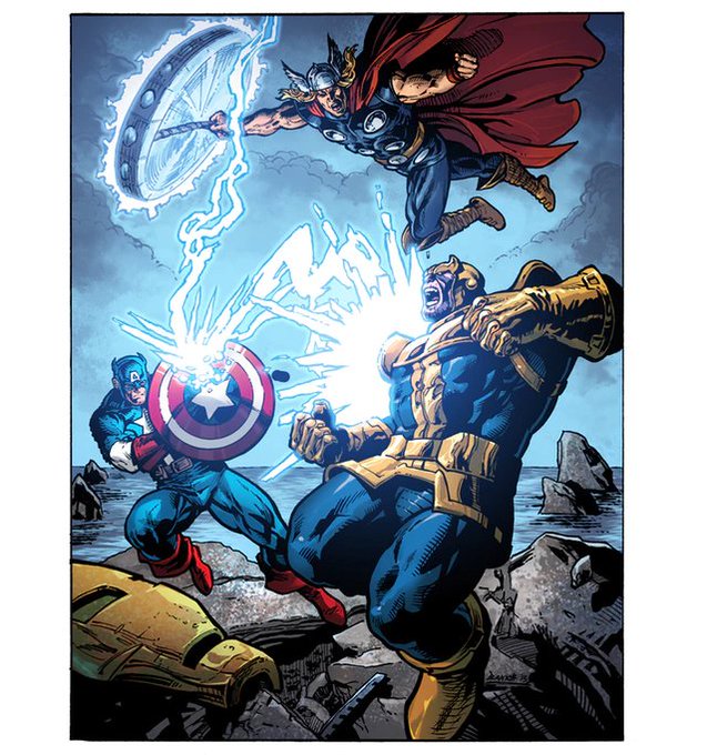 Just revealed: Thanos vs. Cap and Thor pin-up is part of the @RealBankster print set for our Harken's Raiders Kickstarter. https://t.co/wWoNUC4UmL #Avengers4