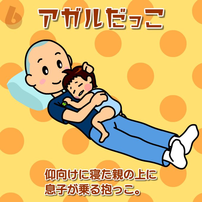 仰向けに寝た親の上に息子が乗る抱っこです。