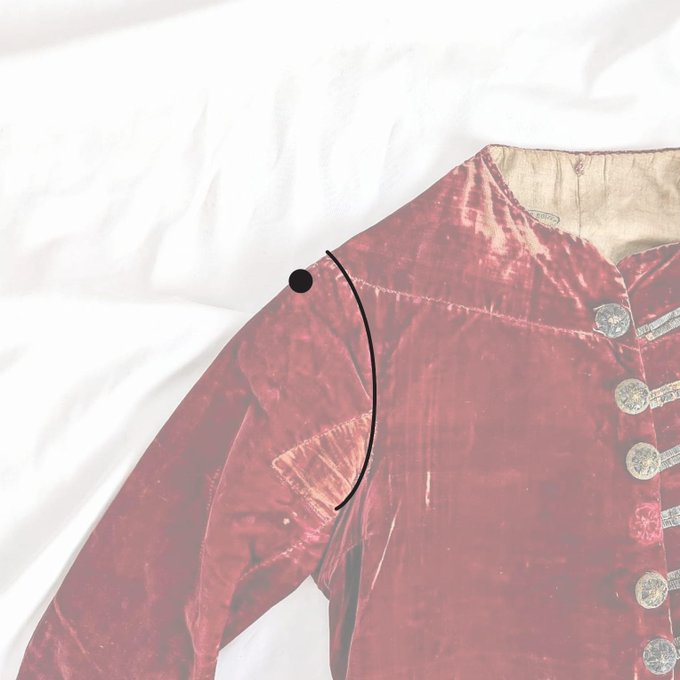 写真1枚目の黒丸が、現代衣服の肩峰位置です 左右の肩峰を計った距離を「肩幅」と言います もしロココのように極端に縫い目を内側にいれるのであれば、袖に細工が必要です 例えばパフスリーブにするとかが解りやすいでしょう しかし、ロココの男性の袖はパフスリーブのように膨らんでいるでしょうか
