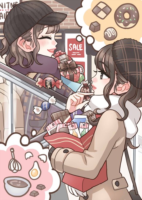 テーマ『バレンタイン』の、峯田茉優さん、天野聡美さんのイラスト描きました! お洋服の色も背景の色も、全体的にチョコっぽい色でまとまるようにしてみました🍫 ちょっとごちゃっとしてるけど、構図は割と気に入ってる…! #まったリミッツ