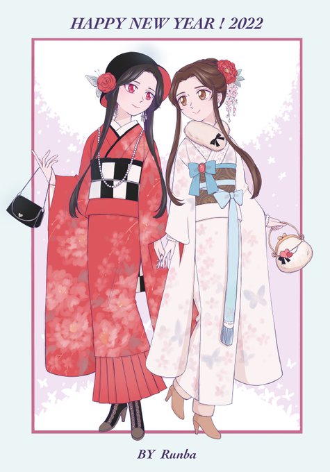 振袖花怜ちゃん♀ ちょっと描き足しver. 殿下は蝶柄の着物に蝶々結びのリボンをいっぱい付けて、花花は白牡丹柄の着物着て、お互いをイメージしたコーデですよ