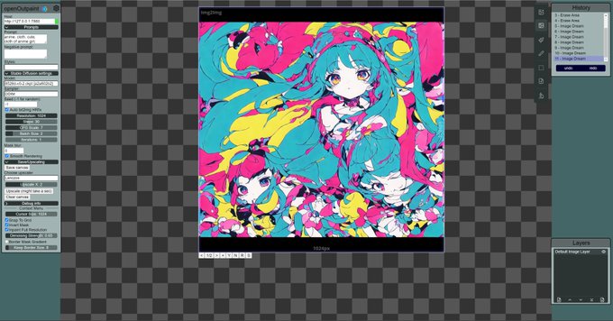 "絵の続き"を生成してくれるOutpainting等をローカルで動かせるツール「openOutpaint」が良い感じ。AUTOMATIC1111 WebUIとの組み合わせで簡単に扱えます。たのしい