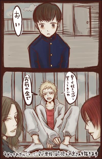 【お題絵】「9RTされたらジャージ姿で、悪役っぽい感じの京さんを描きます」の絵。悪役っつーかなんつうか割と冷静な面持ちのギター隊入れたらF4ぽくなった様な(笑)