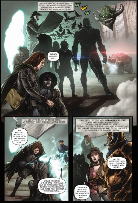Snips from pages published in the "8 Decade Legacy" preview with the inspired scene vs. Government hit squadron.