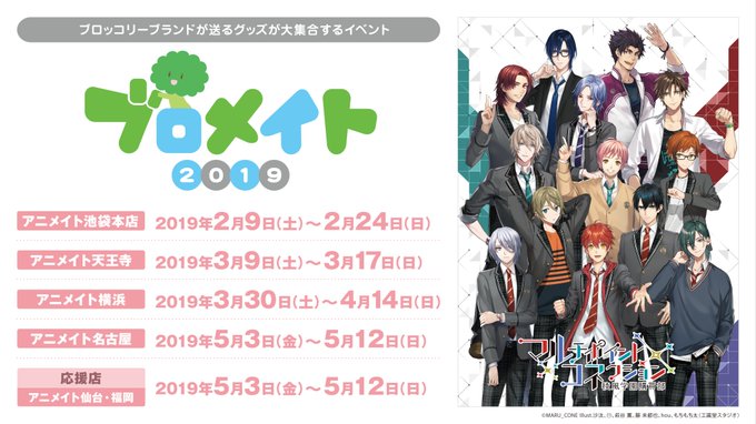 【イベント情報】ブロッコリータイトルが大集合する『ブロメイト2019』が明日2月9日(土)からアニメイト池袋本店で開催!マルコネも初グッズや展示をご用意してお待ちしております。あいにくの天候のようなので、ご来場予定の皆さんは気を付けてお越しください。
