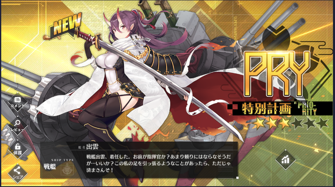 計画艦十一人目は出雲。 頭からミョウガが生えてるって言われてからそうにしか見えなくなった。 いよいよ次で開発自体はラスト一人。 まぁ強化ユニット集めがあるんだが……