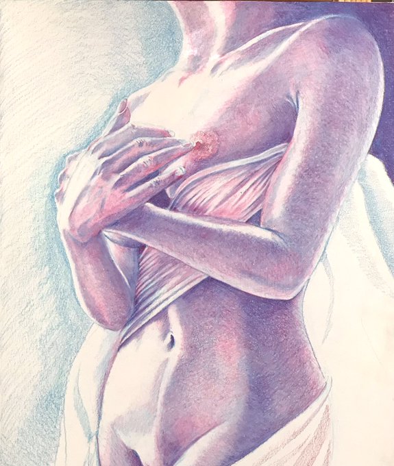 シアン(裸婦のエチュード02)/色鉛筆/F6号/@OfficialWestekカリスマカラー/@muse_paper Do artpaper 完成。シアンとマゼンタ、調整用のホワイトのみで製作。全体乗せちゃうとTwitterやFBはやばいそうなので画像は部分。全体は下記よりご覧ください。 https://t.co/hUFg4D6vB7 #色鉛筆画 #林亮太