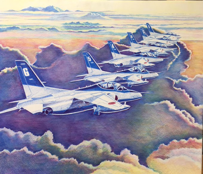 F10号。ここからいよいよ機体を仕上げていく。まず、T-4に2回目のシアンを入れていく。 #色鉛筆画 #林亮太