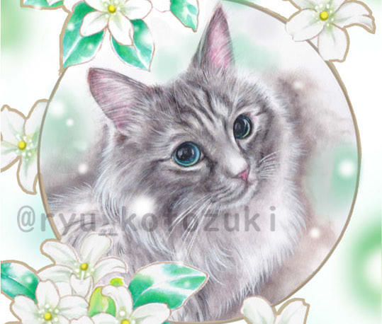 水彩+パステルで画像のご了承頂き、モデル、モチーフに主に猫ちゃん描いてます。