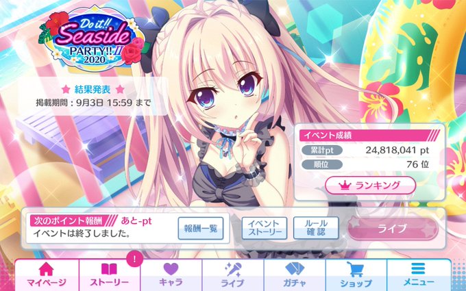 あらそいお疲れ様でした! いろいろ犠牲にしたけど初の100位以内に入る事が出来ました! ツインテ水着天葉様可愛過ぎるぅぅぅぅう
