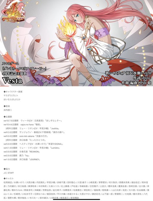 ダンメモのストーリーももちろんむちゃくちゃ凄いだが、ゲーム内のクオリティ高いBGMも沢山いて、何より毎年色んな主題歌も出してるんで、特に今年のいのりんが歌う「Vesta」がとにかく神々しい~! iTunesにまだないからずっとYouTube開きっぱなしで聴いてる🥰 #ダンメモ #いのりんしか勝たん~!