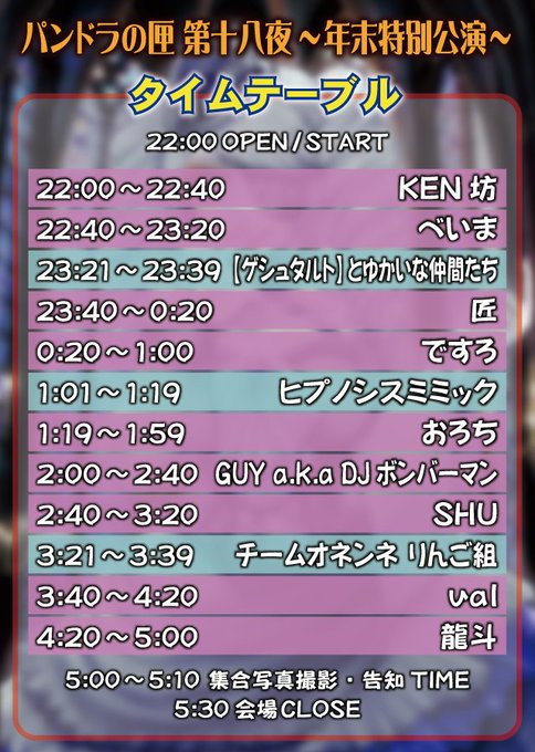 年末の #パン匣 の出演者・スタッフ数えたら42人で過去最大人数で、会場も去年やったとはいえRensaで過去最大キャパだし、時間も一昨年やった野外のパン匣と同じく7時間で過去最長タイなので楽しくないわけがないと思う!よ!
