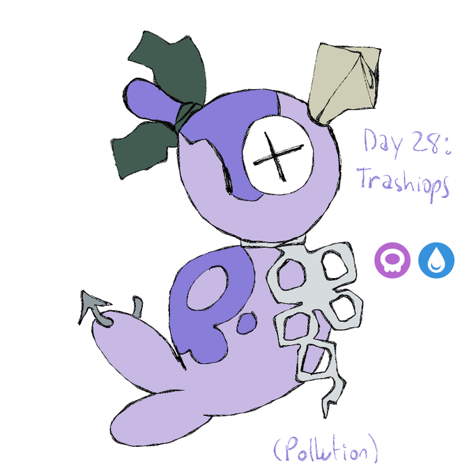 Day 28: Trashiops. based on ocean pollution and bottlenose dolphins. a little too morbid for actual pokemon but hey, ocean pollution is just that scary