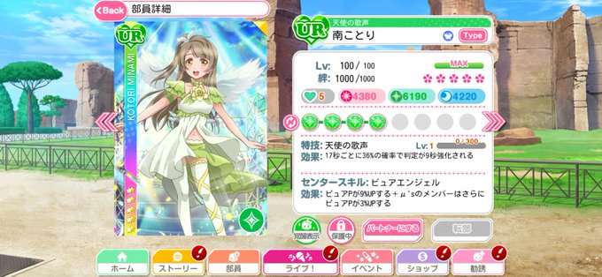 ④続きまして、コトリエルこと、初期URです。ことりちゃんが保健委員であることを証明しているイラストです。個人的にはスキル1で9秒も判定強化するパワーブレイカーが気になって仕方ない。 #スクフェス #南ことり
