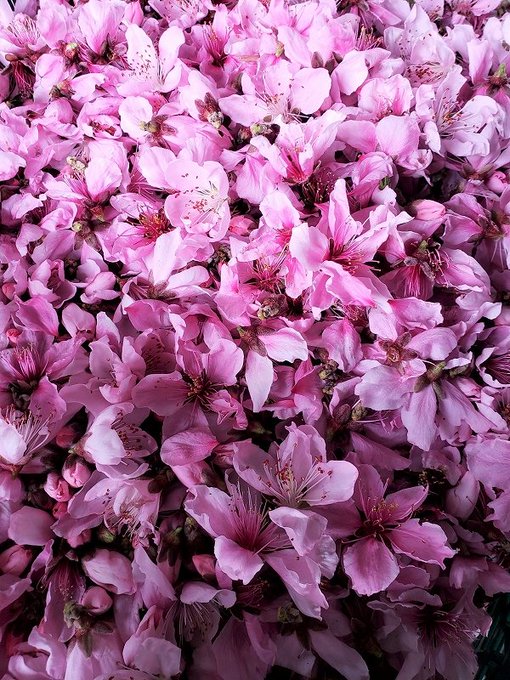 桃のお花さん、ビフォーアフター💁♀️ ちょっと可哀想なんだけど、綺麗に咲いてる花を摘んで花粉を採ったよ🌸 花粉はダチョウの羽根のブラシにつけて他の木に受粉していくよ~🍑夏には美味しい桃になるから待っててネ♪😘 #TLを花でいっぱいにしよう #山梨 #桃