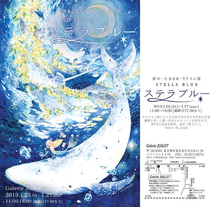那木( @7kiiin )、七生まゆ( @nanao_mayu )、モク( @moku_blue )の3人展「#ステラブルー」大阪会期のDMが完成しました!