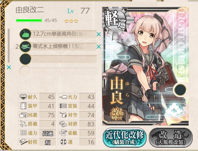 由良改二 改装した! 二日半あれば並の対潜値がある軽巡なら70くらいにはできると知った!