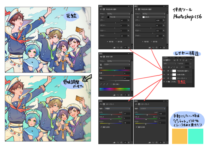 実際の色味調整レイヤーはこんなかんじです。photoshopに限定した特殊なものかもしれませんが…!参考になれるか微妙ですがお納めください