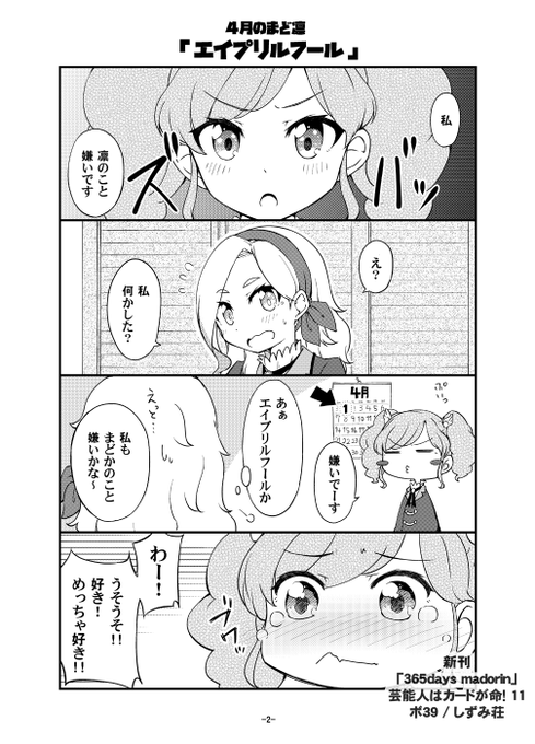 11/20「芸能人はカードが命!11」 (固定用) お品書き+新刊表紙&サンプルです。新刊も既刊もまど凛です。 その他、凛ちゃんTシャツやソレイユアクキー、無料配布のまど凛シールも置いてありますので宜しくお願いしますっ! #芸カお品書き #芸カ11