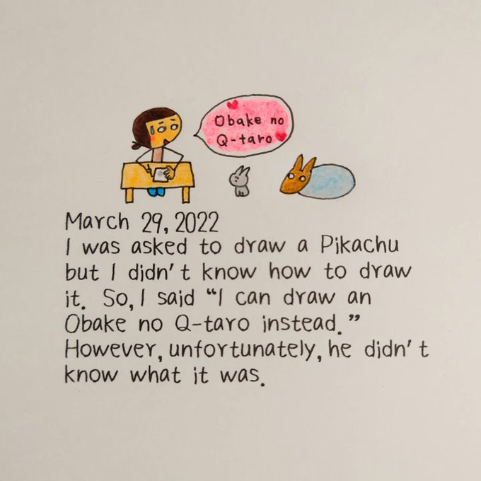 #イラスト好きさんと繋がりたい ピカチュウを描いてと言われたけど 描けないので「おばけのQ太郎なら 描けるよ」って言ったら、Q太郎を 知らなかった(;・∀・)