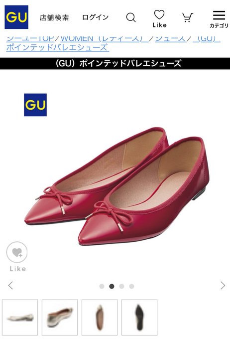 ずーっと迷ってたGUのバレエシューズ買ったー とんがってる靴初めてで履き口浅いけどかわいいし、何より安い。赤が欲しくて買ったけど店頭で見た感じシルバーやゴールドのメタリック系も良さげだった!