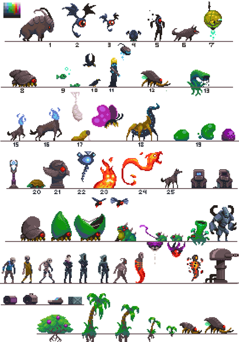 My current Skytorn pixel/concept art sheet. I use it to try to keep everything with a consistent size and style