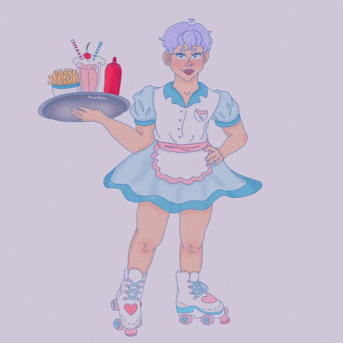 so kyle has a part-time job at a coffeeshop named blue's and kyle being non-binary and the biggest diva they chose the dress as the uniform to work at blue's #ocs #saiphrisocs #originalart