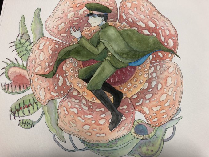 水彩のアレ。平腹の目がお気に入りなのと1番描いてて大変だったラフレシア…