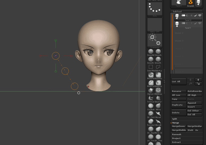 ZBrushはサブツールのフォルダがないのでパーツ1つ1つをサブツール分けてしまうと迷子になると思います。自分の場合関連パーツは1つのサブツールにまとめていて、分割後148パーツの大和も作業中はこんな感じです(一覧表示Ctrl+N)