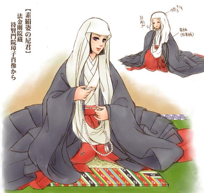 私が法衣沼に落ちるきっかけになった裘代(きゅうたい)と、長素絹。ほぼ同じ型だけど裘代は僧綱襟つき、長素絹にはない。どちらも裾を長く引くのが特徴です。裘代は法皇法親王大納言以上からの入道の宿装束(俗服の直衣)にあたる