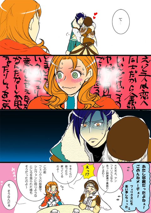 フェリメル+アネット🥰 メーチェのお部屋で二人でお茶してたら偵察だかなんだかに出かけてたフェリクスが帰ってきたとこに出くわしたアネット